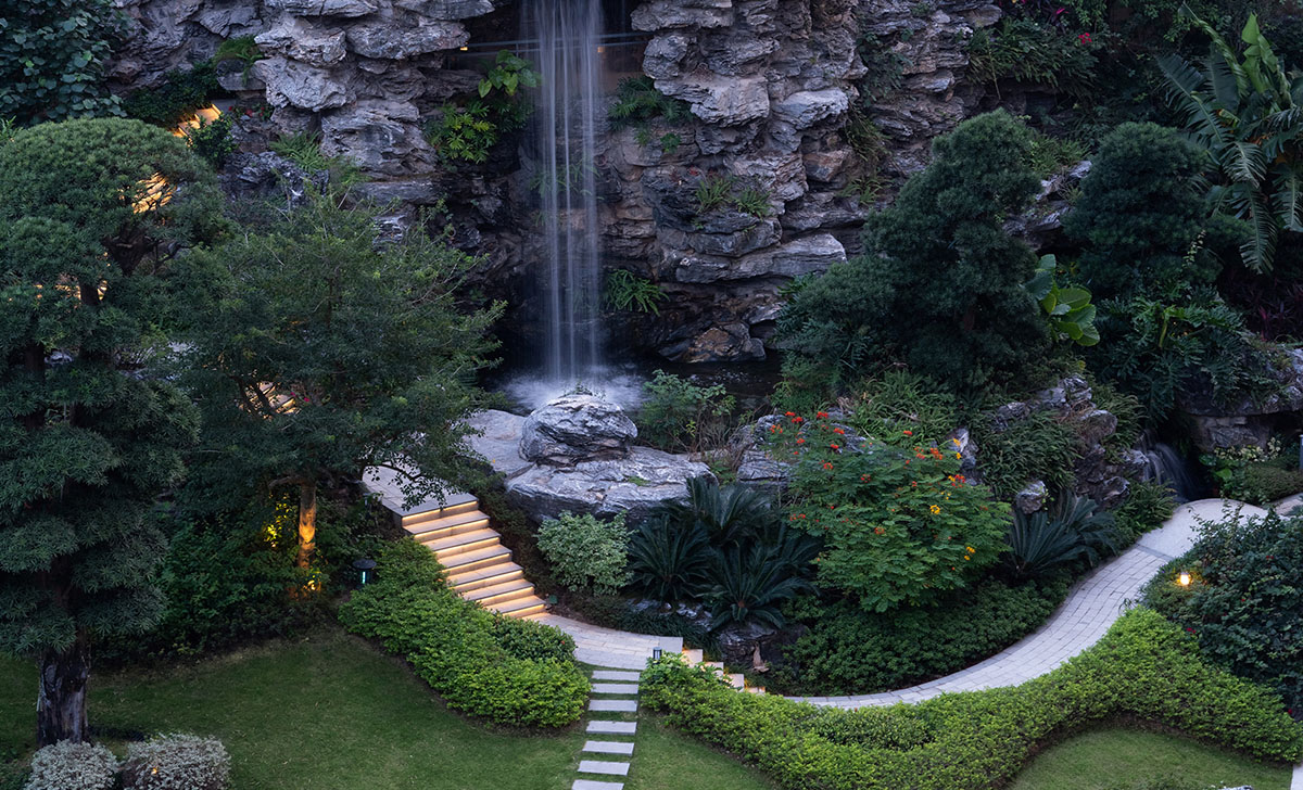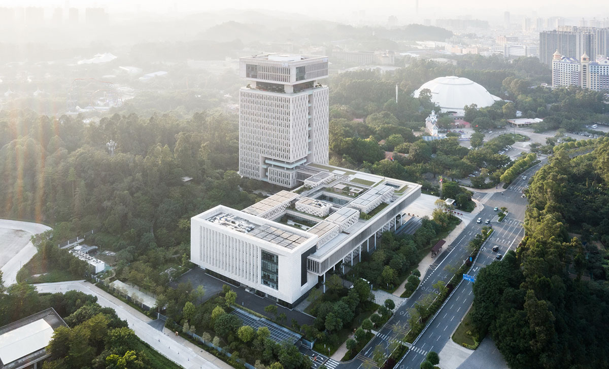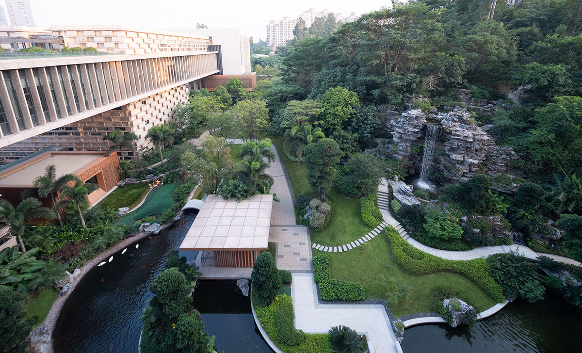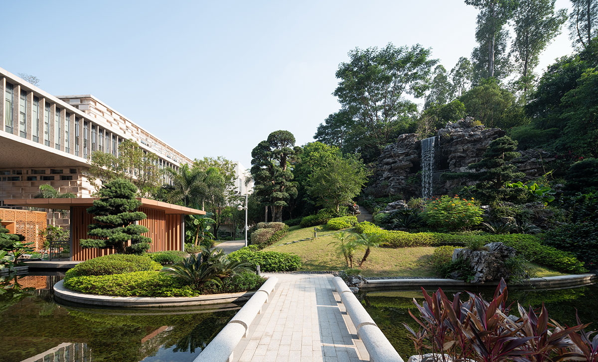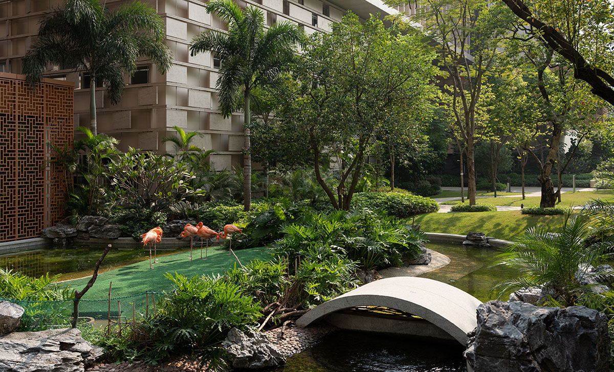 長(zhǎng)隆集團(tuán)總部大樓外部景觀以嶺南園林為原型,嵌入長(zhǎng)隆文化元素, 打造具有嶺南特色的現(xiàn)代企業(yè)文化園林景觀體系。景觀設(shè)計(jì)著力解決建筑、自然、人以及動(dòng)物之間的和諧相處。 將“網(wǎng)紅標(biāo)志景觀”、現(xiàn)代生態(tài)景觀、嶺南精品園、半室內(nèi)山水、動(dòng)物自然棲息地以及員工休閑地集合與空間之中,打造生態(tài)立體辦公超級(jí)綜合體。