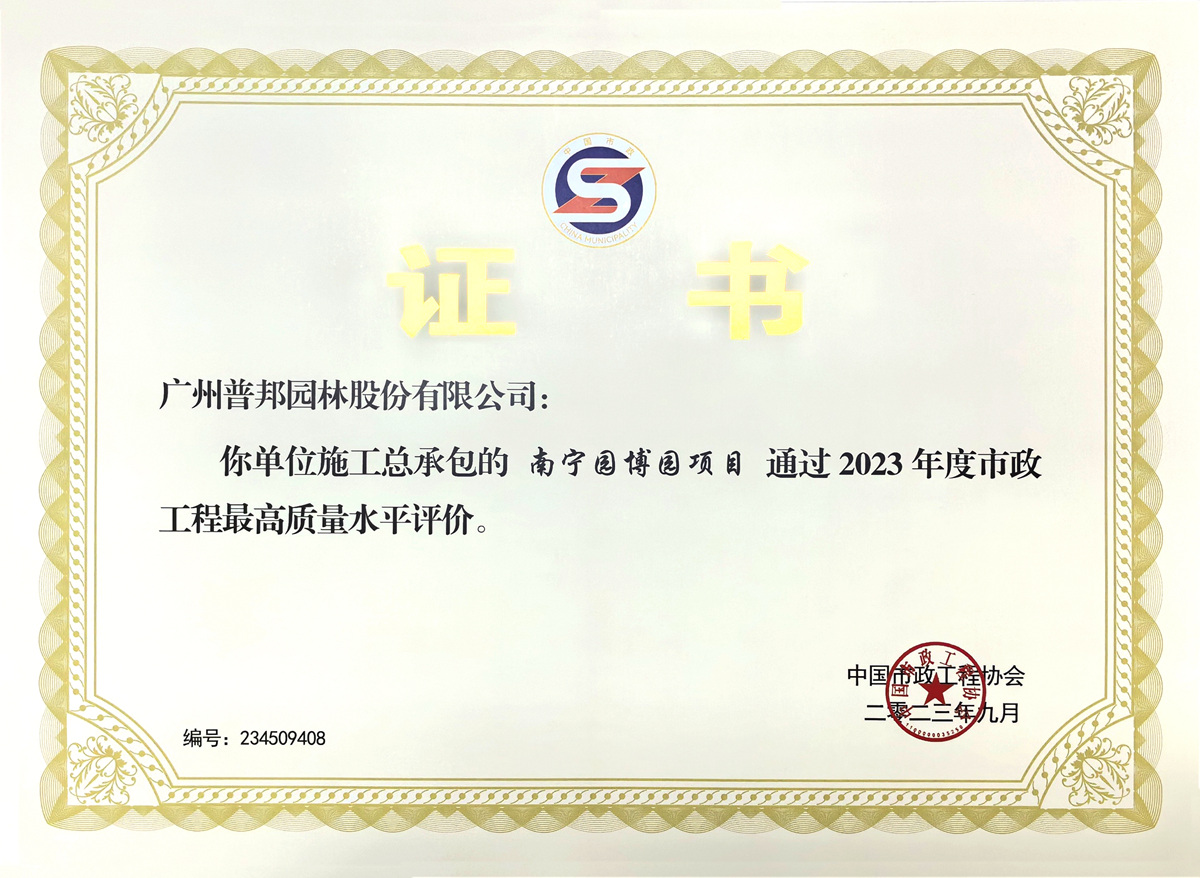 近日,由中國市政工程協(xié)會主辦的2023年度市政工程最高質(zhì)量水平評價工程評選活動落下帷幕,由我司施工總承包的“南寧園博園項目”通過“2023年度市政工程最高質(zhì)量水平評價”。