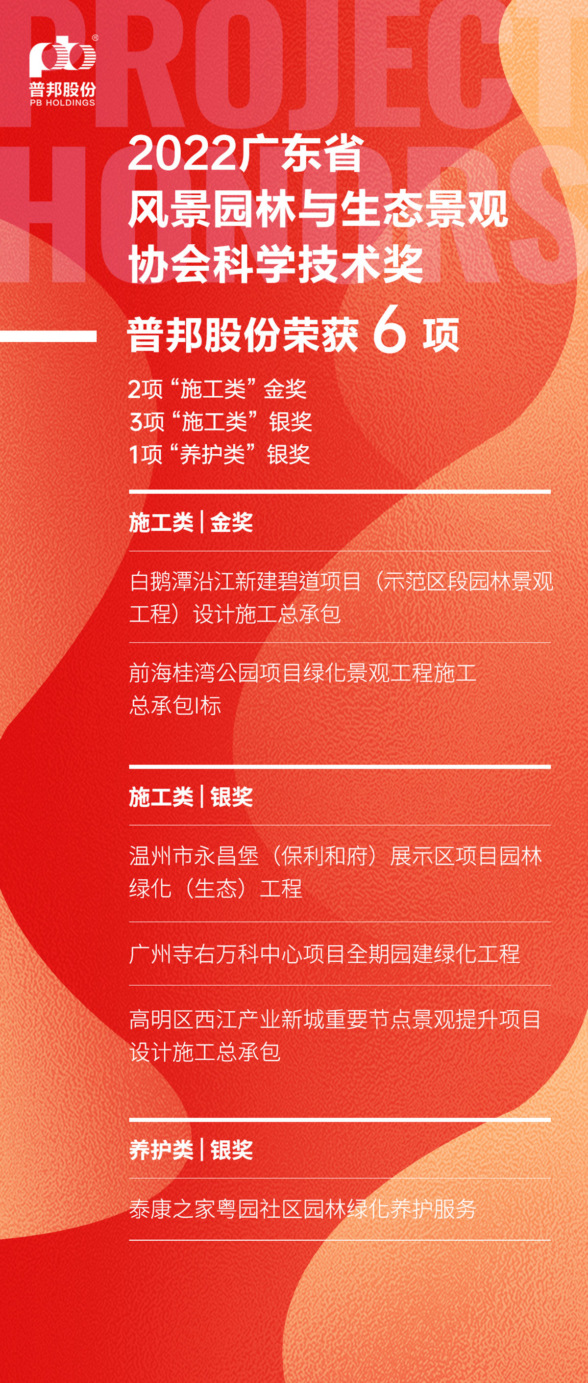 近日,廣東省風(fēng)景園林與生態(tài)景觀協(xié)會(huì)(簡稱“省風(fēng)協(xié)”)公布了2022年度廣東省風(fēng)景園林與生態(tài)景觀協(xié)會(huì)科學(xué)技術(shù)獎(jiǎng)(園林工程獎(jiǎng))獲獎(jiǎng)名單。我司斬獲6項(xiàng)大獎(jiǎng),包括施工類金獎(jiǎng)2項(xiàng)、施工類銀獎(jiǎng)3項(xiàng)、養(yǎng)護(hù)類銀獎(jiǎng)1項(xiàng)。
