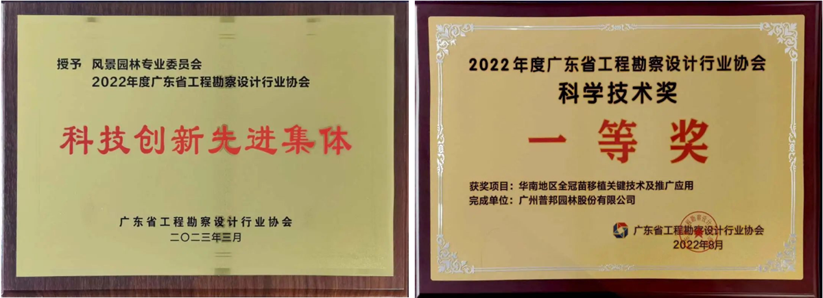 下午,在科技創(chuàng)新優(yōu)秀成果展示交流及頒獎(jiǎng)典禮中,我司榮獲多項(xiàng)殊榮,科研工作實(shí)力得到協(xié)會(huì)與業(yè)界同行的高度認(rèn)可。其中,我司作為主任委員單位的風(fēng)景園林專業(yè)委員會(huì)單位榮獲2022年度廣東省工程勘察設(shè)計(jì)行業(yè)協(xié)會(huì)“科技創(chuàng)新先進(jìn)集體”稱號(hào);《華南地區(qū)全冠苗移植關(guān)鍵技術(shù)及推廣應(yīng)用》、《珠江三角洲地區(qū)園林樹木高效抗風(fēng)關(guān)鍵技術(shù)與應(yīng)用》分別榮獲2022年度廣東省工程勘察設(shè)計(jì)行業(yè)協(xié)會(huì)“科學(xué)技術(shù)獎(jiǎng)一等獎(jiǎng)”、“科學(xué)技術(shù)獎(jiǎng)二等獎(jiǎng)”;譚廣文先生榮獲2022年度廣東省工程勘察設(shè)計(jì)行業(yè)協(xié)會(huì)“科技創(chuàng)新領(lǐng)頭人”稱號(hào),葉勁楓先生榮獲第二屆“廣東省杰出工程勘察設(shè)計(jì)師”稱號(hào)。