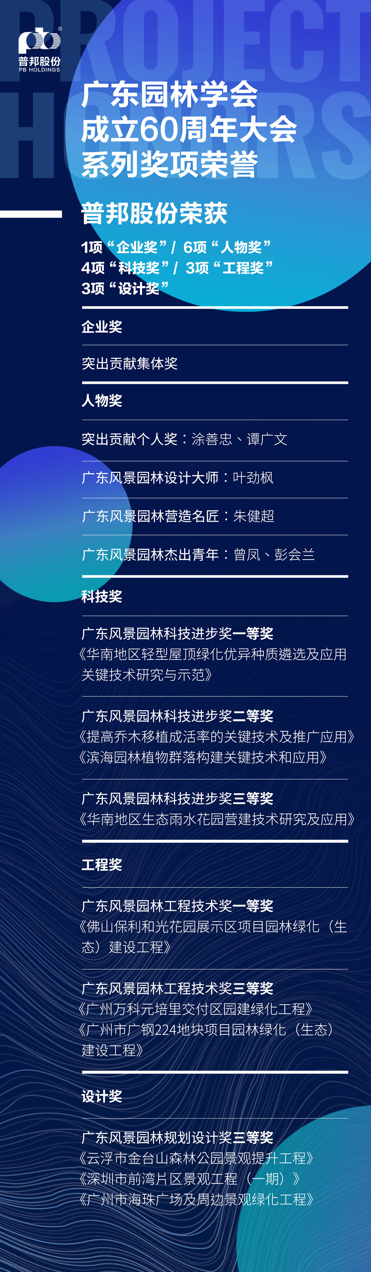 3月26日,在慶祝學(xué)會(huì)成立60周年大會(huì)開幕式上,石安海理事長總結(jié)了學(xué)會(huì)60年來的發(fā)展情況和未來工作目標(biāo),并表示嶺南園林已被國際學(xué)術(shù)界公認(rèn)為中國古典園林藝術(shù)的三大風(fēng)格流派之一,勉勵(lì)業(yè)界同仁共同譜寫嶺南園林新篇章。大會(huì)表彰了廣東園林學(xué)會(huì)突出貢獻(xiàn)獎(jiǎng)與廣東園林學(xué)會(huì)科學(xué)技術(shù)獎(jiǎng)(含科技獎(jiǎng)、工程獎(jiǎng)、設(shè)計(jì)獎(jiǎng))等榮譽(yù),普邦股份憑借實(shí)力榮獲多項(xiàng)學(xué)會(huì)殊榮。