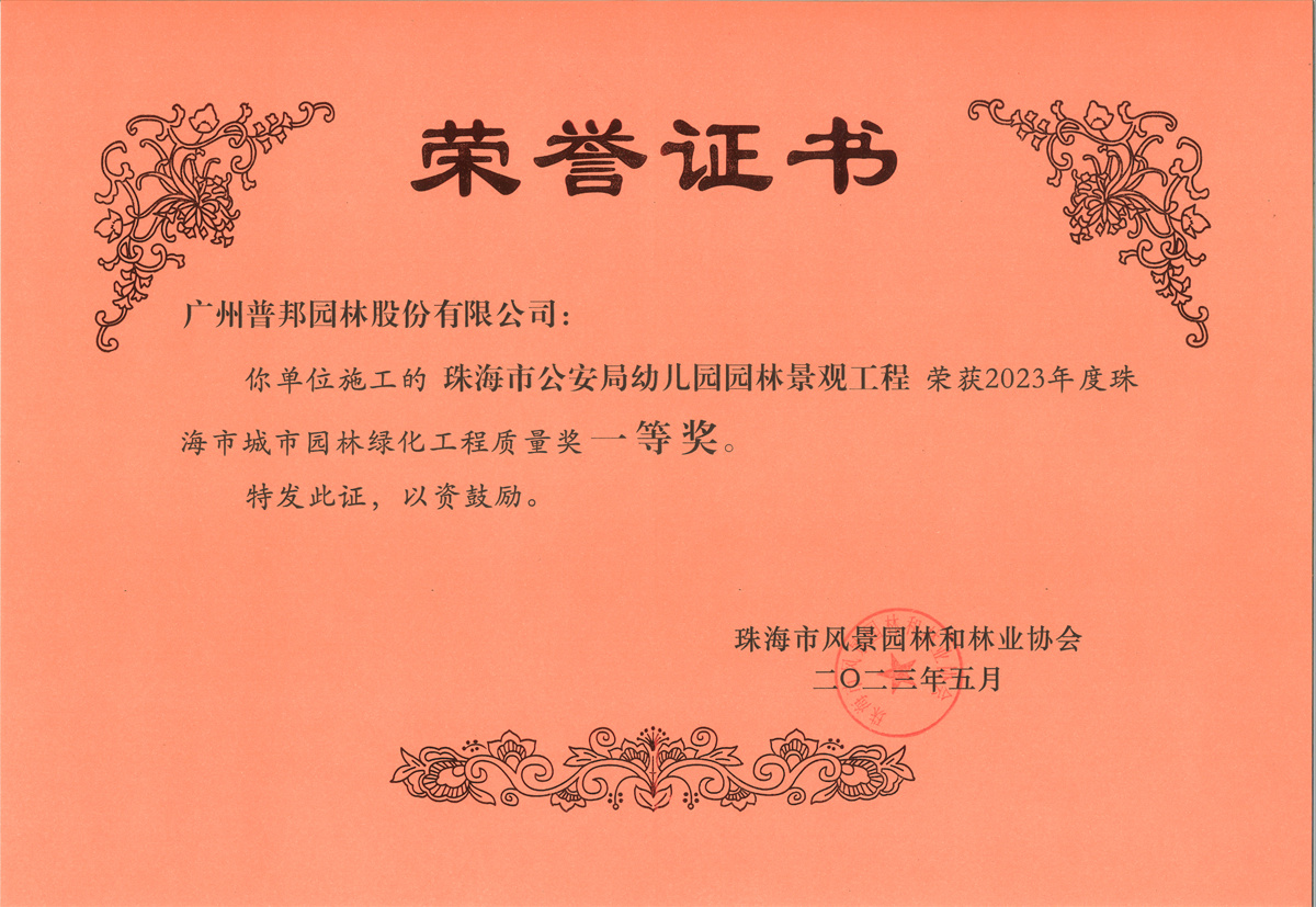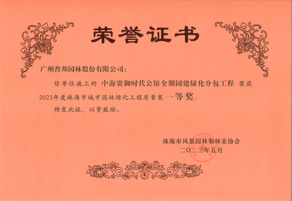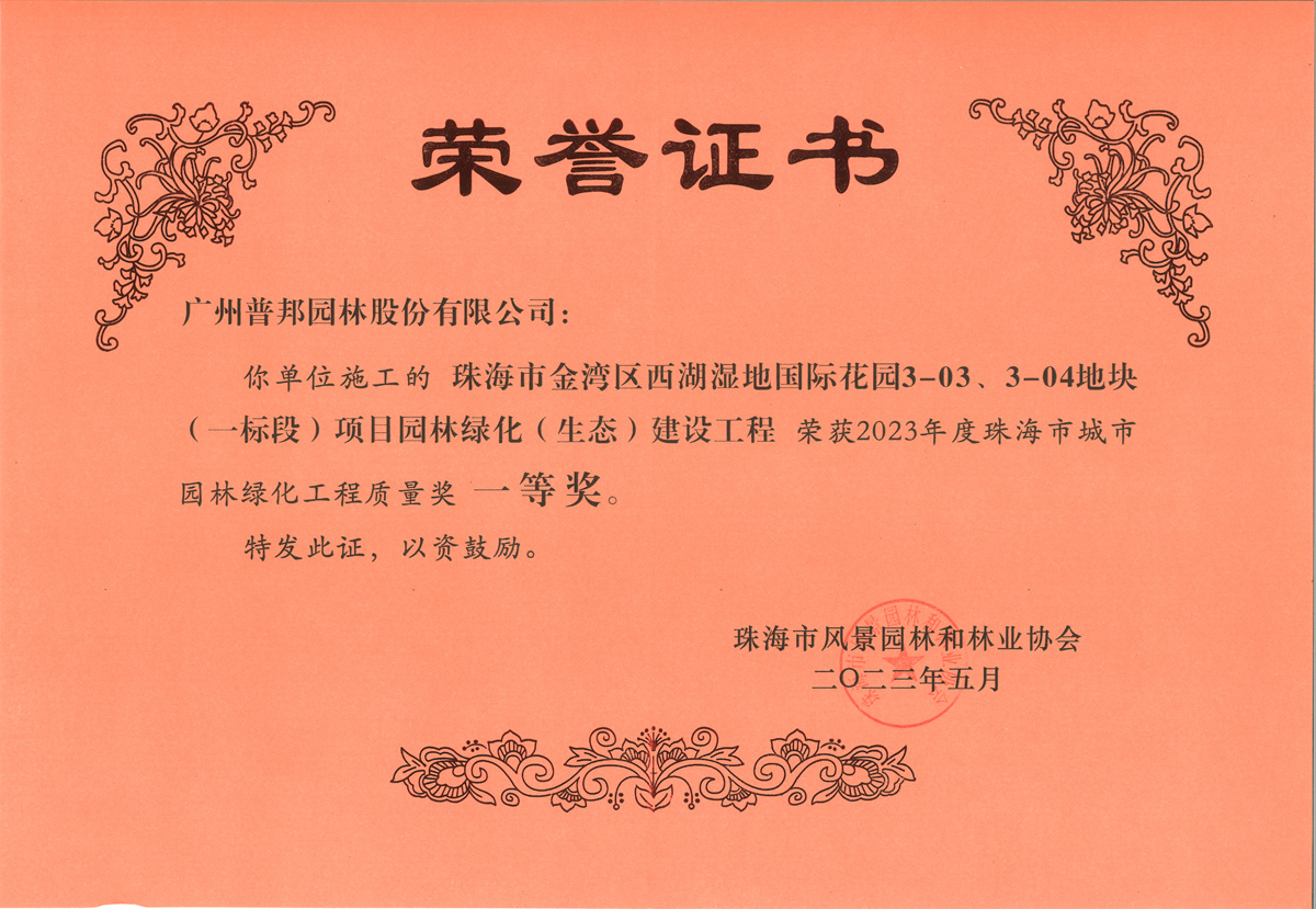 珠海市城市園林綠化工程質(zhì)量獎評選活動主要評選在全市具有引導(dǎo)和示范作用的園林綠化優(yōu)秀工程,旨在提高珠海市城市園林綠化工程建設(shè)質(zhì)量和水平。該獎項是珠海市園林綠化工程的最高獎項,設(shè)一、二、三等獎。我司參評的3個項目榮獲一等獎,是珠海市園林行業(yè)協(xié)會對我司工程項目精湛品質(zhì)的高度認(rèn)可。
